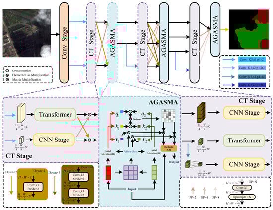 Clouds and cloud shadows are irregular. Effectively segmenting thin clouds, strip clouds, and residual clouds has always been crucial for accurate cloud and cloud shadow segmentation []. This paper introduces a parallel multi-scale architecture to address these challenges, yet the issue of effectively integrating multi-scale information remains unresolved. To tackle this, we propose AGASMA in this paper. Figure 4 illustrates the architecture of the proposed model.