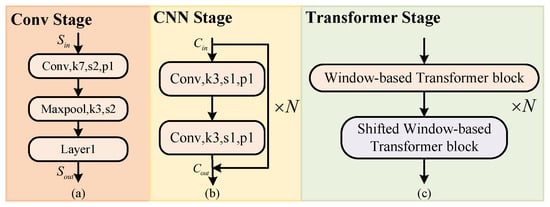 It is well-known that Transformers can model long-distance dependencies and capture global feature information in images [,]. To address the CNN model’s limitations in global modeling [,], we integrate the Swin Transformer with the CNN model during feature extraction. Equal amounts of CNN and Transformer sub-modules are added at the same feature extraction stage. The interaction between the CNN model and the Transformer model enables the extraction of detailed and spatial features separately. Within the same feature extraction stage, it effectively combines fine and coarse, high-resolution and low-resolution features, establishing an information interaction platform between the Transformer and the CNN.