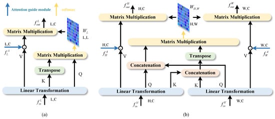 Unlike the traditional model based on axial attention, this paper used three branches to reconstruct the features. First, the input feature size was , and we serialized it and input it into three branches through the Layer normalization operation. Two of the branches mainly performed global attention on the features in the two dimensions of height and width. Because the Transformer ignores the position information when capturing the global information, the position encoding was embedded before the axial attention and SMA. For cloud detection tasks, there is usually a lot of noise in the dataset, which causes a lot of interference to accurate prediction. Therefore, this paper used an AGM based on channel and space to guide axial attention and V in SMA, so as to alleviate the interference of noise on prediction. Finally, the features were restored to the original size and fused with the original features.