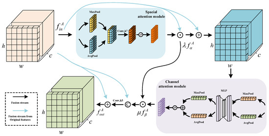 where represents the sigmoid activation function, represents the global average pooling, represents spacial attention, and represents Channel Attention. The shared parameter and is initialized to 1 and then participates in back propagation for adaptive adjustment.