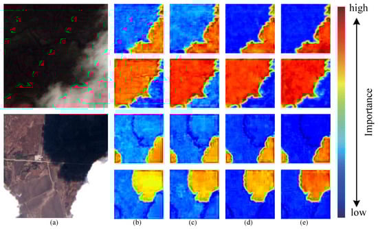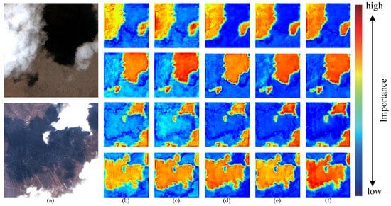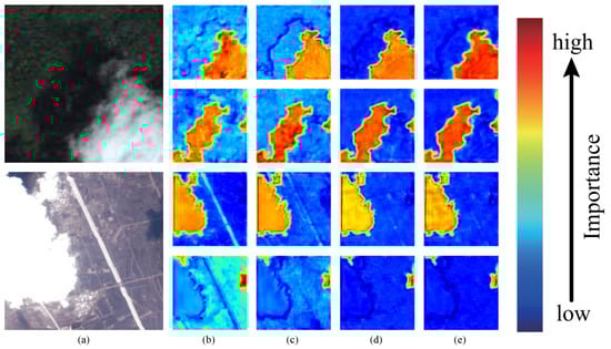 In Figure 8, a heatmap with different attention is visualized. The redder the image is, the higher the distribution weight is. The bluer the image is, the lower the weight is. The test image is shown in Figure 8a. The first line of each image is to detect the cloud, and the second line is to detect the cloud shadow; (b) and (c) are heatmaps without and with axial attention, respectively. It can be clearly seen that axial attention has excellent positioning ability for objects, and that boundary segmentation has also been improved. The position where attention needs to be focused becomes redder and the noise is reduced. After adding SMAtt, the information exchange between the two dimensions of height and width is strengthened. As shown in the heatmap (d), the model’s attention to the object that needs attention is significantly enhanced and the noise reduction effect is significant. At the same time, the segmentation boundary is clearer and the noise is further weakened. The Attention Guidance Module is added to (e) to further guide the axial attention in the spatial and channel dimensions. In addition to the predicted object, the attention is lighter, the pixel weight distribution is more reasonable, and the boundary prediction is at its clearest. The white road in the second image causes strong interference in the accurate detection of the cloud. After adding the axial attention, the interference is significantly reduced. After adding SMAtt, the interference of the white road is further reduced. After adding AGM, the interference is at its lowest and the attention to the cloud is also improved.