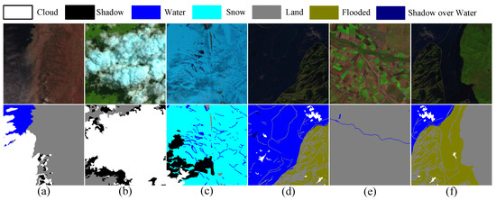 SPARCS dataset part of the image display: (a) Hilly. (b) Forest. (c) Snowfield. (d) Waters. (e) Farmland. (f) Flooded.