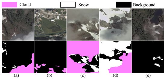 There are many difficulties and challenges in cloud detection tasks. Clouds and their shadows exhibit diverse shapes and structures, with complex textures that heighten detection complexity. Furthermore, varying lighting conditions and weather fluctuations can disrupt accurate cloud segmentation []. Similar colors and features among categories—such as clouds and snow, cloud shadows and water, and cloud shadows and dark ridges within the same image—add further complexity to cloud detection [].