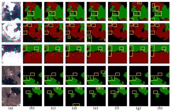 Comparison of different methods in different scenarios for the Cloud and Cloud Shadow dataset: (a) Test images. (b) Label. (c) Ours. (d) DBPNet. (e) OCRNet. (f) DBNet. (g) HRvit. (h) PSPNet.
