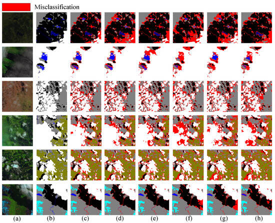 Comparison of different methods in different scenarios of SPARCS dataset: (a) Test images. (b) Label. (c) Ours. (d) DBPNet. (e) DeepLabv3. (f) OCRNet. (g) DBNet. (h) MPvit.