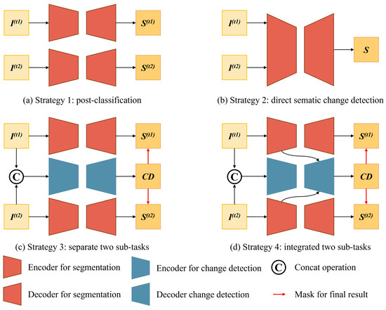 As a multiple-task process, SCD can be divided into land cover classification and region-of-change detection. There are four types of network structures commonly used for SCD, as shown in Figure 2 [5]. The first type is post-classification (Figure 2a), where two temporal images are independently segmented; the final SCD result is acquired by comparing the two temporal land cover classification results. This ignores the relationship between the two temporal images [34]. The second strategy sees one type of “from-to” as one class and inputs two temporal images to obtain the changed categories of the feature (Figure 2b). In this situation, there will be too many classes for segmentation [9]. The first two strategies see SCD as one task, which has been abandoned now. The third strategy splits SCD into two subtasks (Figure 2c). The two temporal images are concatenated to obtain the region of change, and the two temporal images are segmented independently. The final result is obtained through the land cover classification being masked by the region of change. The third strategy carries out two subtasks separately, which lacks communication between the deep features of the two temporal images [9]. The fourth strategy (Figure 2d) treats SCD as two integrated subtasks, which utilizes the deep features of two temporal images for region-of-change detection. Most of the current binary change detection networks adopt Strategy 4 [43,44]. Most existing network structures for SCD are improvements on Strategy 4, where the weight-sharing semantic segmentation branches are used for land cover classification in two temporal images, and the deep features of the images after feature extraction are concatenated and sent to a new decoder for region-of-change detection. Yang et al. located semantic changes through the feature pairs obtained from the feature extraction structures [45]. Zheng et al. utilized the temporal symmetry of two temporal images to fuse the deep features of images for SCD in ChangeMask [46]. Zhou et al. used a graph convolutional network to process the features after feature extraction to obtain the SCD result [47]. Ding et al. proposed two structures in [19], which even utilize the relationship between two temporal images for land cover classification. Moreover, transformer has been introduced into SCD; Yuan et al. designed a transformer-based encoder to extract the features of two temporal images [48]. As for SCD, we want to obtain the precise region of change and land cover classification within the changed region, which makes it vital that the network pays more attention to the changed region. However, the existing methods ignore this. In our method, we not only facilitate the network to make full use of both global and detailed information while fusing features but also facilitate the network to focus on the region of change by adding a change-aware mask branch.