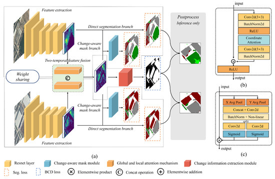 During feature extraction, ResNet34 was used as the backbone [50]. ResNet34 consists of four layers, which can be expressed as . Every layer is composed of several ResBlocks, and the numbers are 3, 4, 6, and 3, respectively. After each layer, the feature map is downsampled with a larger receptive field but with the loss of detailed information occurring at the same time. The obtained feature maps from the backbone were directly subjected to classification to yield the land cover prediction results. In order to enhance the preservation of spatial details, we eliminated the downsampling operations in and of ResNet34. The global and local feature information of the two temporal remote sensing images were captured using the GLAM, and the feature maps were fused using a concatenation operation. By using the change information extraction module, we can obtain the final changed region prediction result. The change information extraction module is composed of four attention-guided residual modules (Figure 3b), where the coordinate attention mechanism (Figure 3c) was introduced to make the network focus more on the important region. In the change-aware mask branch, the two temporal feature maps are guided by change information to obtain land cover classification.
