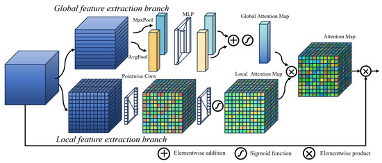 where represents the different pointwise convolution operations. During the operation, a 1 × 1 convolution operation is performed on the extracted feature map, and the BN operation and ReLU are used. In , we used a different weight 1 × 1 convolution operation to extract the local features, and we utilized a BN operation to normalize the feature map. Ultimately, is obtained through the operation, which states the local attention map. This branch can extract more fine-grained features from images, which contributes to more accurate results. The final attention map is obtained by performing elementwise processes on the global attention map and local attention map.