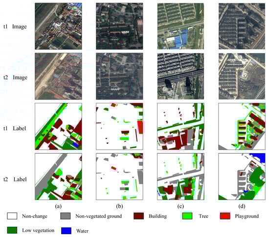 The SECOND dataset contains a series of two temporal remote sensing images from different sensors on multiple platforms, covering several cities (including Shanghai, Chengdu, etc.). The images also include three bands corresponding to R, G, and B wavelengths, with spatial resolutions ranging from 0.5 m to 3 m. Figure 7 presents several samples from the SECOND dataset. It includes six land cover categories: non-vegetated ground, building, tree, low vegetation, water, and playground. There are 2968 image pairs of size 512 × 512 pixels. For this dataset, we divided the images into a training set of 2375 and a testing set of 593 using a random splitting method.