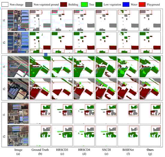 In order to validate the effectiveness of the proposed CGMNet for region-of-change detection and land cover classification in SCD tasks, we selected some mainstream BCD methods, including CLNet [35], BIT [42], DESSN [36], and AERNet [37], as well as SCD methods, including HRSCD3 [18], HRSCD4 [18], SSCDl [19], and BiSRNet [19] as competing algorithms. Considering the fact that hyperparameters are quite important to model performance, to ensure fair comparison experiments, we followed the settings in their original literature.