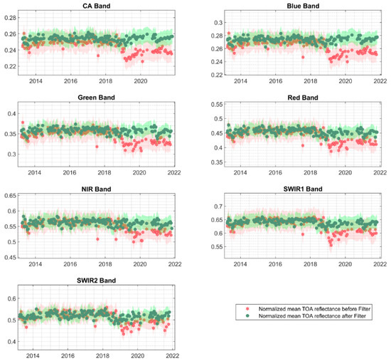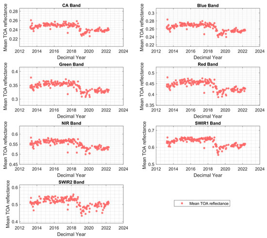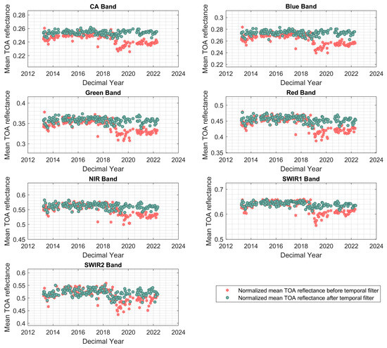 To estimate the change in temporal mean TOA reflectance before and after the temporal change, the mean of the mean TOA reflectance was computed for both time frames in both datasets. This analysis was performed separately for each band. Table 7 presents the computed differences in reflectance units, as well as the percentage change relative to the temporal mean TOA reflectance of the stable time frame (2013–2019) for both pre-filtered and post-filtered datasets. Notably, for the pre-filtered dataset, the red band exhibited the largest mean TOA reflectance difference, with an average difference of −7.5% between the TOA reflectance before and after the temporal change. Conversely, the coastal aerosol band showed the lowest difference of −4.6%. In contrast, the same analysis was performed on the post-filtered dataset, revealing considerably reduced differences. The coastal aerosol band demonstrated the lowest difference, with values as low as −0.1%. On the other hand, the red band exhibited the highest difference of only −1.6%, indicating a notable reduction of 5.9% in the TOA reflectance difference before and after the temporal change after the application of the temporal filter mask obtained in this study. This reduction suggested that the temporal filter effectively minimized the temporal variations in the post-filtered data, leading to a more stable time series.