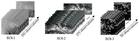 BRDF effects were managed differently depending on the dataset used at each stage of this process. For instance, the data cubes generated in Section 2.2.1 for each ROI contained per-pixel time series. However, these time series exhibited a seasonal effect. This seasonal effect was attributed mainly to the bidirectional reflectance distribution function (BRDF) of the target. The substantial variation in the sun’s position across several seasons caused the majority of this BRDF variability. In order to reduce the seasonality effect, the 4-angle BRDF model developed in the SDSU IP LAB was generated and applied to each pixel [31]. BRDF-normalized time series were stored in new data cubes for the three ROIs used in this study. The 4-angle BRDF model is shown below: