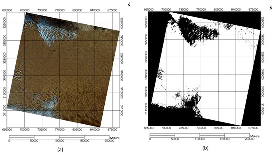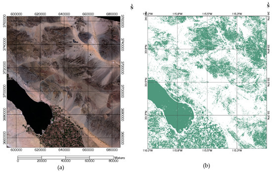 (a) RGB image of WRS-2 path 39/row37 showing different land cover types such as crops, water, sand, rock formations, etc.; (b) temporal filter mask obtained in this study over the same region of part of WRS-2 path 39/row 37.