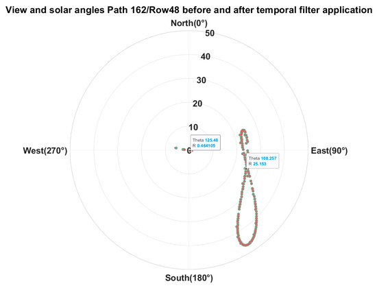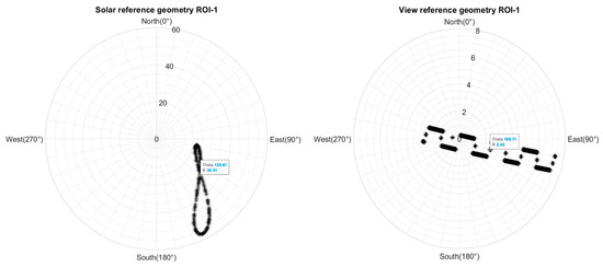 where is the resulting BRDF-normalized TOA reflectance, is the Landsat 8-OLI TOA reflectance, corresponds to the TOA reflectance predicted by the BRDF model, and is the reference reflectance estimated using a reference geometry of acquisition (solar and view geometries). For the solar reference geometry, a polar plot was used to display the solar geometry for a single randomly chosen pixel over time; the center value was selected as the reference solar geometry. In addition, the view geometry of the same scene for which the solar geometry was chosen was displayed using a polar plot. The center value in the polar plot was selected as the reference view geometry for each ROI. In this work, all pixels in each ROI were normalized to a reference reflectance computed using that acquisition reference geometry. An example of the reference geometry selection for ROI-1 is shown in Figure 5, where SZA = 30.51, SAA = 129.67, VZA = 2.42, and VAA = 109.11.