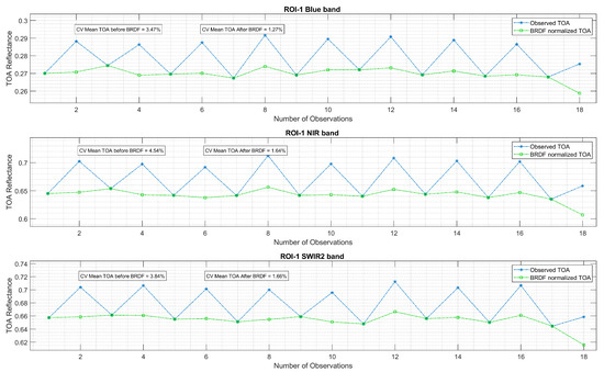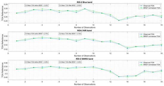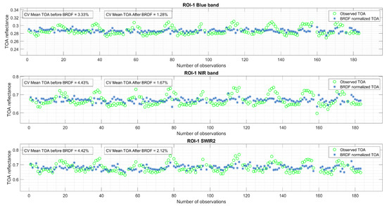 An example of the BRDF normalization is presented in Figure 6 (temporal mean TOA reflectance of a randomly selected pixel from ROI-1 using all the data available in the SDSU IP LAB archive), which includes known temporally stable pixels such as those from the Libya 4-CNES ROI. In the figure, the original observed mean TOA reflectance is represented in green, while the BRDF-normalized mean TOA reflectance is shown in blue. The seasonality effect, particularly noticeable in the NIR band, can be observed for this pixel. However, the BRDF-normalized data demonstrated a reduction in the seasonality effect in the same band. To quantify this reduction, the coefficient of variation (CV), expressed as a percentage, is included in the charts. The CV is estimated as the ratio of the standard deviation of the temporal mean TOA reflectance to the mean of the temporal mean TOA reflectance for the given pixel. The decrease in CV indicates a reduction in the seasonality effect within the pixel time series.
