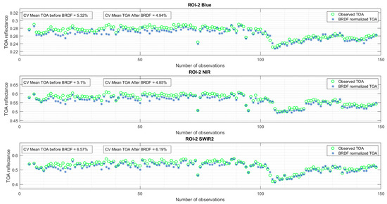 In addition, an example of BRDF application on a pixel in the Middle East region, demonstrating temporal instability and characterized by predominantly sand and rock land cover, is shown in Figure 7 (temporal mean TOA reflectance of a randomly selected pixel from ROI-2 using all the data available in the SDSU IP LAB archive). It can be observed that the seasonal effect was less pronounced compared with the pixel shown in Figure 6. The reduction in the CV further indicated a decrease in the seasonality effect for this location. Importantly, the BRDF application did not change the inherent temporal behavior of the time series; instead, it reduced the seasonal effect while maintaining the pixel’s temporal characteristics. These temporal characteristics were later evaluated through statistical analysis, as described in Section 2.3.