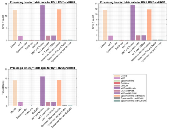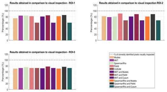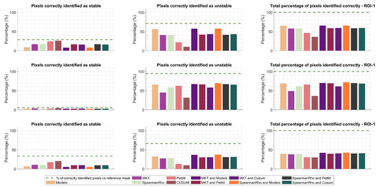The performance of each test or combination of tests used to generate binary masks for the three ROIs was evaluated by comparing them to visually inspected samples, as described in Section 2.3. The percentage of pixels correctly classified as temporally stable or unstable was computed for each test or combination of tests based on the visually inspected samples. The results, presented in Figure 11 and Table 2, showed that the CUSUM control chart had the lowest performance across all testing sites. On the other hand, the combination of the Mann–Kendall and Pettitt’s tests and that of the Spearman’s rho and Pettitt’s tests were among the top-performing tests across all three sites.