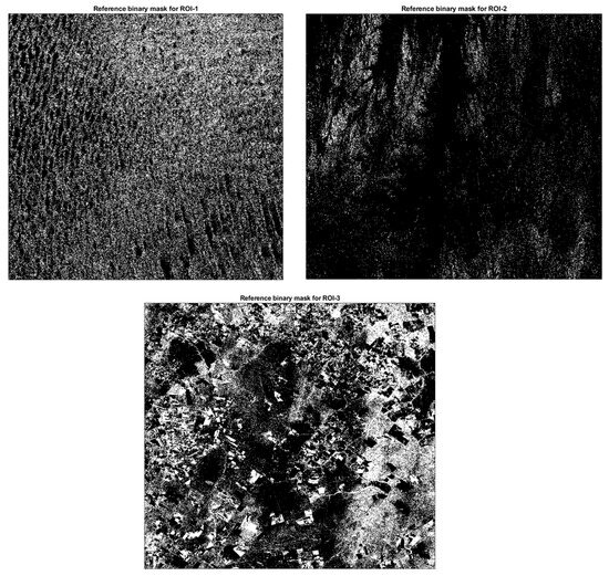 The analysis revealed that the combination of the Spearman’s rho and Pettitt’s tests consistently demonstrated results that were among the top three most accurate for all three ROIs. While the combination of the Mann–Kendall test and Pettitt’s test showed similar outcomes, the combination of the Spearman’s rho and Pettitt’s tests retained a greater number of pixels for ROI-1, where Libya 4-ROI is located, while being equally effective in removing unstable pixels from ROI-2. Hence, the binary mask derived from applying the Spearman’s rho and Pettitt’s tests was selected as the reference binary mask for step 1, as explained in Section 2.3. Figure 12 displays the reference binary masks containing temporally stable pixels identified by the combination of Spearman’s rho and Pettitt’s test, where the white regions represent the stable pixels. These masks were then taken as a reference to assess the performance of each test on the data cubes with shorter time series (18 points per pixel). Table 3 represents the percentage of temporally stable and unstable pixels in the reference binary masks for each ROI after the application of tests.