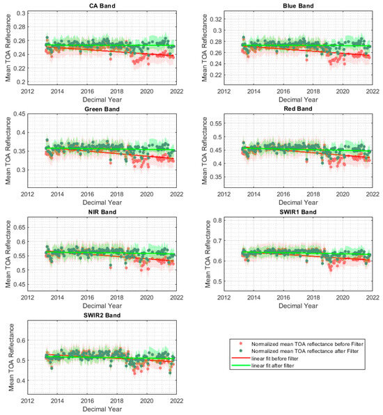 To further validate the effects of the temporal filter developed in this study on the mean TOA reflectance, a statistical analysis was conducted to validate the temporal stability of the mean TOA reflectance trend derived from the study area WRS-2 path 162/row 48. This involved evaluating the significance of the slope through linear regression analysis on the temporal mean TOA reflectance for both the pre-filter and post-filter datasets.