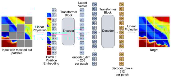 20] demonstrated the remarkable effectiveness of ViTMAE to reconstruct masked images. This included images with 75% masked data, a remarkable inference. ViTMAE achieves this by splitting an image into patches and tokenizing them. The tokens are processed through a transformer block (encoder) to generate latent vectors. These latent vectors, which represent the model’s understanding of a token’s relationship to other tokens, are then passed through another transformer block (decoder) that reconstructs the image. Central to ViTMAE’s success was its training on a large corpus of unmasked, natural images, and, given the reduced complexity of most remote-sensing data compared to natural images, one may expect even better performance.