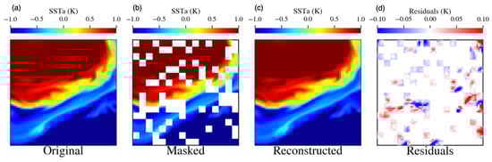 = 30). Aside from patches along the outer edge of the input image, it is difficult to visually differentiate the reconstructed pixels from the surrounding SSTa values. The greatest difference is 0.19 K and the highest root mean square error (RMSE) in a single