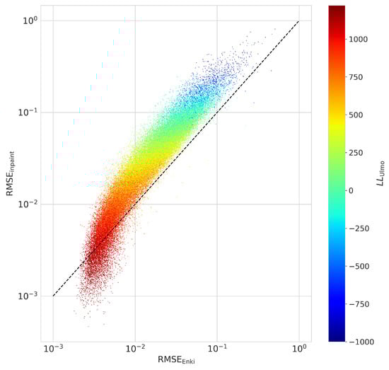 Figure 9, a scatter plot of RMSE for biharmonic inpainting versus RMSE for