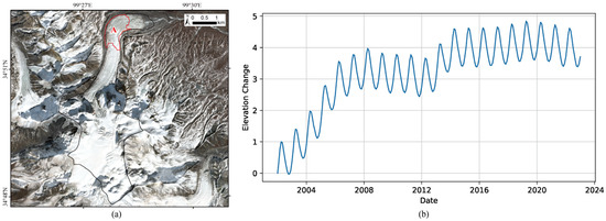 To investigate the elevation’s increase in the middle of the ice tongue of Weigeledangxiong Glacier, we extracted the average elevation time series of region A labeled in Figure 4a. The time series is shown in Figure 4b, with strong seasonal variations. From the figure, the elevation of this region increases from 2002 to 2008, keeps slightly decreasing until 2013, increases again between 2013 and 2015 and becomes stable until 2023. This needs further investigation.