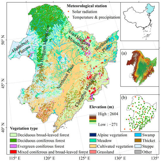 Northeast China refers to the northeastern part of China, which encompasses Heilongjiang, Jilin, and Liaoning Provinces, as well as Chifeng, Hulunbuir, Tongliao Cities, and Xing’an League in the Inner Mongolia Autonomous Region. This region experiences a temperate continental monsoon climate. The northeast region is surrounded by the Changbai Mountains in the east, the Xiao Hinggan Mountains in the north, and the Da Hinggan Mountains in the west. In the middle and south, it is characterised by the expansive Northeast Plain (Figure 1). In 2020, the resident population of Northeast China was 109,083,887, a decrease of 7,520,463 people compared with 20 years ago. Northeast China exhibits distinct variations in heat and humidity levels, ranging from warm to cold temperate zones in the south-to-north direction and from humid to semi-humid and semi-arid zones in the east-to-west direction. These variations contribute to the formation of diverse vegetation distributions. This region is sensitive to global climate change and has become an important area for the study of global climate change and terrestrial ecosystems [35].
