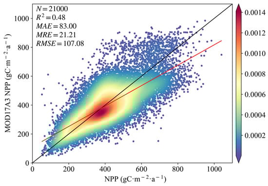 The reliability of estimated NPP results can be verified by field observed values or indirect methods. The latter was employed to validate the NPP results estimated based on the CASA model because of the large area and complex vegetation types in the study area, where field-observed NPP was difficult to obtain. MOD17A3 products have been widely accepted worldwide and can be used as a reference for estimated NPPs to indirectly evaluate the reliability of those estimated NPPs [40]. From 2000 to 2020, 1000 valid NPP values of MOD17A3 were randomly selected per year in the study area and were compared and analysed with the estimated NPP at the corresponding time and location. The CASA model characteristics and MOD17A3, with some missing values in the study area, determined that MOD17A3 could not be used directly to represent NPP in this study.