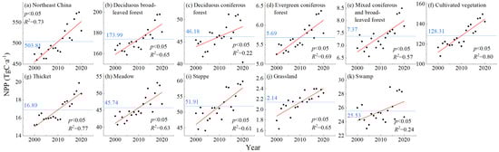 Trends in annual total NPP by vegetation type from 2000 to 2020 in Northeast China. The mean value of the annual total NPP is marked with a blue dotted line, and its trend is marked with a red line.