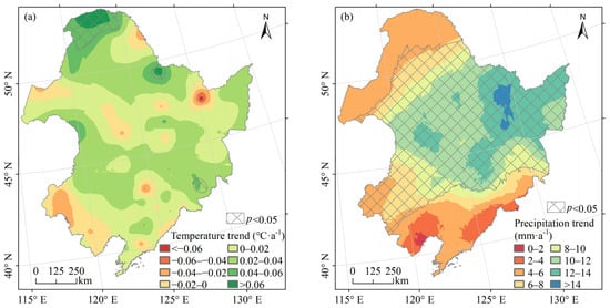 Changes in annual mean temperature and annual precipitation in Northeast China from 2000 to 2020. (a) shows the trend of annual mean temperature; (b) shows the trend of annual precipitation.