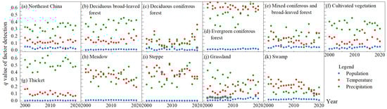 The factor detection method of the GeoDetector was employed to detect the extent to which temperature, precipitation, and population, respectively, explained the spatial differences of vegetation NPP in Northeast China from 2000 to 2020. The q value measured the degree of influence of the factor, with larger q values indicating a stronger influence of the factor on vegetation NPP. The q values for precipitation in Northeast China from 2000 to 2020 ranged from 0.17 to 0.39, for temperature from 0.03 to 0.18, and for population from 0.01 to 0.05 (Figure 8a). The q values of the factors for each year were ranked, in descending order, as precipitation, temperature, and population, indicating that precipitation had the greatest influence on the spatial differences in vegetation NPP in Northeast China, followed by temperature and the smallest population. Figure 8b–k shows the q values of the factor detections of temperature, precipitation and population for the different vegetation types. For deciduous broadleaf forests, cultivated vegetation and thickets in Northeast China, precipitation had the greatest effect on their spatial variation in NPP, followed by temperature and population last. For evergreen coniferous forests, temperature was then the strongest effect of spatial differences in NPP, with precipitation slightly second and population the weakest. For deciduous, coniferous forests, mixed coniferous and broad-leaved forests, meadows, steppes, grasslands and swamps, the dominant factor of spatial differences in NPP changed irregularly over time between temperature and precipitation. The effect of population on the spatial differences in NPP across vegetation types was considerably lower than that of temperature and precipitation factors.