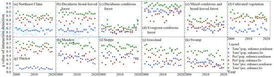 The interaction detection method of the GeoDetector was applied to detect the extent to which any two factors collaboratively among temperature, precipitation and population explained the spatial differences in vegetation NPP in Northeast China from 2000 to 2020. The results were also measured by q values. As shown in Figure 9, the interaction types were bi-factor enhancement and nonlinear enhancement, which indicated that the interaction of any two factors increased the influence on the NPP of Northeast China and each vegetation type, that is, the vegetation NPP was influenced by both climate and population together, rather than a single factor. From 2000 to 2020, for Northeast China and its vegetation types, the q value of the interaction of precipitation and temperature ranked top for each year. In Northeast China, deciduous broad-leaved forests, cultivated vegetation, and thickets ranked second in terms of q value for the interaction of population and precipitation and third in terms of q value for the interaction of population and temperature. Conversely, for evergreen coniferous forests, the q value of the population-temperature interaction ranked second, and the q value of the population-precipitation interaction ranked third. For deciduous, coniferous forests, mixed coniferous and broad-leaved forests, meadows, steppes, grasslands and swamps, the q value for population-precipitation interaction and population-temperature interaction changed irregularly between the second and third ranks. The results revealed that climatic factors had a greater impact on the spatial differences of NPP in Northeast China and its vegetation types than the population from 2000 to 2020.