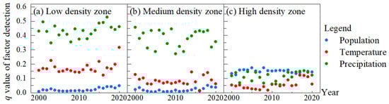 As seen in Figure 6a, the spatial distribution of the population in Northeast China was uneven. The natural break method was used here to classify the mean population of Northeast China from 2000 to 2020 into three categories, namely, low-density population zone, medium-density population zone, and high-density population zone (Figure A4). The extent to which temperature, precipitation, and population, respectively, explained the spatial differences in NPP by population size in Northeast China from 2000 to 2020 was analysed. As can be seen in Figure 10, in the low and medium density zones, the q values of the population were between 0.01 and 0.05 during 2000–2020, much smaller than the q values of temperature and precipitation due to the low disturbance of the population to the environment. The q values of the factors for each year were precipitation, temperature, and population in descending order, which indicated that precipitation had the strongest effect on the spatial variation of vegetation NPP in low and medium-density zones, followed by temperature and the weakest population. In the high-density population zone, the overall order of q values from 2000 to 2020 was population, precipitation, and temperature in descending order, i.e., population had the strongest effect on NPP spatial differences, precipitation was slightly followed by precipitation, and temperature was the weakest.