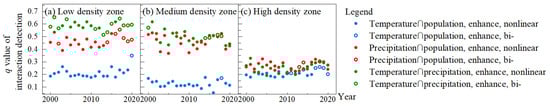 The extent to which any two factors collaboratively among temperature, precipitation and population explained the spatial differences in vegetation NPP by population size from 2000 to 2020 was analysed. Similarly, the interaction types were bi-factor enhancement and nonlinear enhancement (Figure 11), again suggesting that vegetation NPP was affected by a combination of climate and population. In the low-density zone, in each year from 2000 to 2020, the q value of the interaction between precipitation and temperature ranked first, the q value of the interaction between population and precipitation ranked second, and the q value of the interaction between population and temperature ranked third. In the medium-density zone, the q values for the interaction of temperature and precipitation were similar to those for the interaction of population and precipitation, both being greater than the q values for the interaction of population and temperature. In the high-density zone, the q-values of temperature-precipitation interaction, temperature-population interaction, and precipitation-population interaction were not much different, with the q-values of population-precipitation interaction being slightly higher than those of temperature-precipitation interaction and population-temperature interaction.