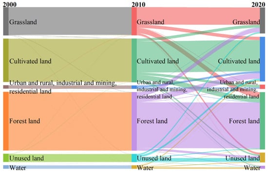 Population spatial distribution data (2000–2020) were derived from the WorldPop dataset (https://www.worldpop.org/) (accessed on 11 June 2024), which had been adjusted to UN national population estimates. Each pixel, whose size is 1 km × 1 km, records the number of people in the corresponding pixel. WorldPop population data were based on multi-source information and a semi-automated dasymetric mapping method to spatialise the population. It can well show the heterogeneity of population distribution and has been widely used [30]. County-level population statistical data for 2000, 2010 and 2020 were obtained from the fifth, sixth and seventh national censuses, respectively.