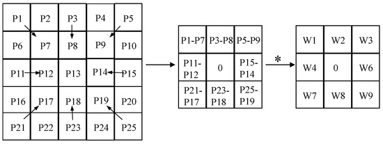 The computational process of APDC is delineated in Equation (3). The PDC module can be transmuted into the equivalent standard convolution. This transformation modifies the disparity between pixels into disparities between weights, yielding updated weights. Such a modification leads to reduce computation, thereby simplifying the entire PDC. The rationale for converting CPDC and RPDC is explicated in Equations (4) and (5), where RPDC manifests as a convolutional layer with a kernel size of 5. The specific conversion process is illustrated in Figure 5.