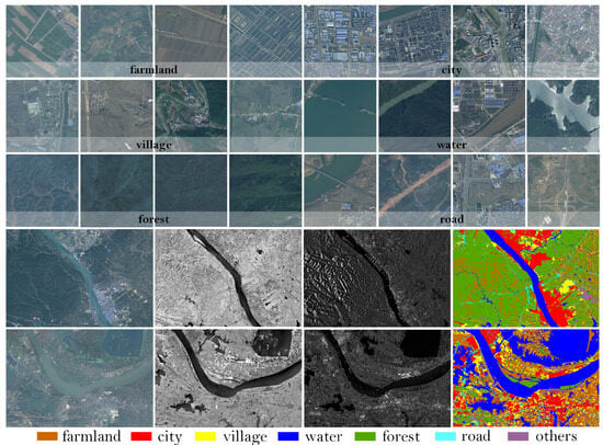 This dataset is the inaugural and most extensive land-use classification dataset, integrating optical and SAR images with comprehensive annotations. Covering approximately 50,000 km2 in Hubei Province, China, the dataset includes SAR images measuring 5556 × 3704 pixels, as illustrated in Figure 10. The study area is characterized by a subtropical monsoon climate, encompassing altitudes that vary from a low of 50 m to a peak of 3000 m. Featuring a diverse range of topographies and vegetation, the dataset is segmented into seven primary classes: farmland, city, village, water, forests, roads, and others. Representative instances of these classes are depicted in Figure 11. The WHU dataset comprises a total of 29,400 images, which were divided in our experiments into train, val, and test sets in a ratio of 8:1:1. Specifically, the training set contained 23,520 images, while the validation and test sets each comprised 2940 images.