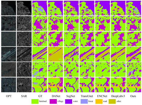 To evaluate the superiority of our multimodal algorithm over other unimodal approaches and to emphasize the positivity of multimodal data, we examined seven scenarios for visualization and quantitative comparisons, as illustrated in Figure 12. Highlighted in the figure are deficiencies in certain categories of unimodal algorithms, such as poor edge continuity and significant pixel confusion, leading to numerous false predictions in water and other unidentified regions. The introduction of optical images enhances algorithms by leveraging color and edge features, resulting in the improved identification of village and water regions. Our approach demonstrates a reduction in misclassified regions, leading to an enhancement in detection accuracy. Table 1 shows that the three main indicators—OA, Kappa, and mIoU—experience increases of at least 7%, with substantial improvements for the two categories of water and village. Overall, our method demonstrates strong accuracy and robustness across all categories, surpassing other unimodal algorithms.