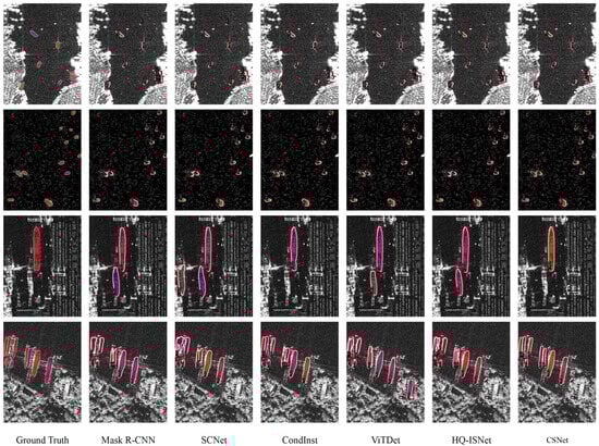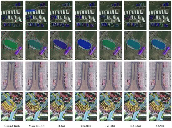 Figure 6 illustrate sample segmentation instances from the NWPU dataset and SSDD dataset. In the qualitative results of the NWPU dataset, in the scene of the car park, CSNet has the best precision and recall rate, and the segmentation of the vehicle contour is accurate; in the airport scene, CSNet has the best processing of the edge of the aircraft mask; in the playground scene, CSNet can achieve smooth, continuous and angular segmentation edges of large and small objects. In the port scene, CSNet accurately segments each port. In the qualitative results of the SSDD dataset, CSNet can also accurately detect and segment images with complex backgrounds and dense ship arrangements. These visualization results validate the superiority of our CSNet in the task of instance segmentation.