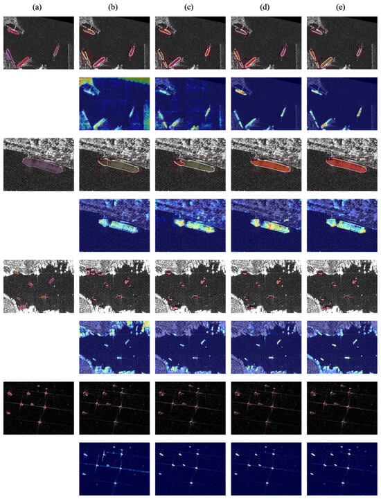 The impacts of the main component are as follows: We designed module experiments to verify the impact of each module on the performance of the model and added PFFPN, CABH, and SGMH to the baseline model in turn (the baseline model uses SAM’s image encoder as the backbone, simple FPN as the neck, and the head design uses Cascade Mask R-CNN’s bbox head and mask head). In order to fully prove the effectiveness of each module, we conducted experiments on NWPU and SSDD datasets, and the results are shown in