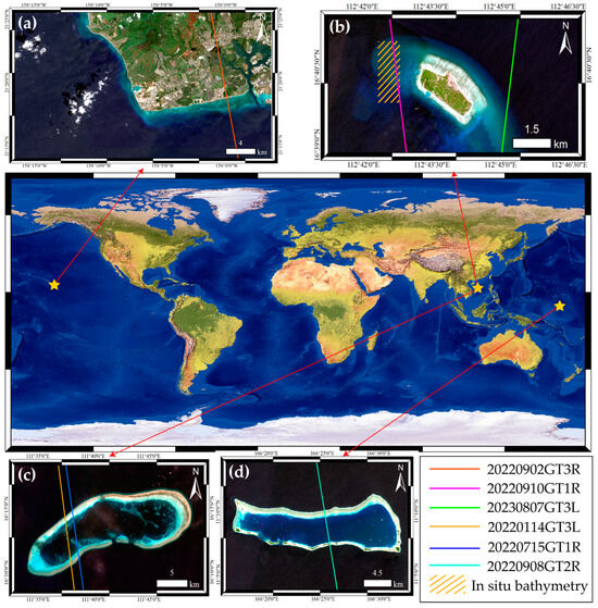 Distribution of Experimental Areas. (a) Oahu Island; (b) Dongdao Island; (c) Huaguang Reef; (d) Ailinginae Atoll. The solid lines in each study area represent the flight trajectory of ICESat-2, and the yellow diagonal lines in (b) represent the in situ depth measurement data.
