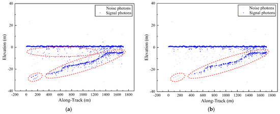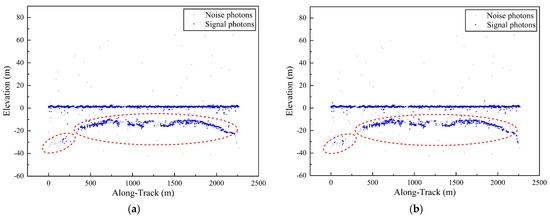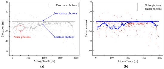 As some of the photon cloud data lack direct validation results, manually annotated photon cloud classification data were predominantly used for validation. In the original data, two distinct density clues were identified (as shown in Figure 2a). It has been demonstrated in many studies that these two lines represent sea surface photons and seafloor photons, respectively, while other scattered photons are noise [7,24,30,31,32,33,34,35,36]. The photon cloud data were imported into specialized software, where photons were manually annotated and classified into noise photons (marked with red) and signal photons (marked with blue). All annotated photon data from the experimental areas were used as the validation dataset. Ensuring the integrity and continuity of these two lines allows for the extracted reference data to be effectively used as the validation dataset [17,37]. Additionally, to minimize the impact of subjectivity in data extraction, high-confidence photons from ICESat-2 (confidence = 4) were used as the benchmark for the reference data. Following this strategy, the ICESat-2 signal photons extracted through visual interpretation formed a reference dataset consisting of six tracks. Figure 2b displays the classification results for the Huaguang Reef.