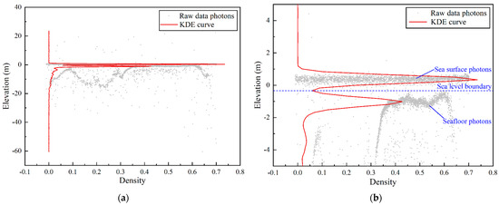 In the KDE curve analysis, the closest minimum point below the first local maximum of the curve is selected as the boundary threshold between sea surface photons and seafloor photons. This method is based on the following assumptions: the first local maximum of the curve represents the local maximum photon density, which usually corresponds to reflected photons from the sea surface, and the minimum point below the first local maximum marks a significant reduction in photon density, which can be used as the natural boundary between reflected photons from the sea surface and photons scattered from the water. Based on this, photons are divided into two categories: photons located above the minimum point are classified as sea surface photons; and photons below the minimum point are identified as seafloor photons (as shown in Figure 4).