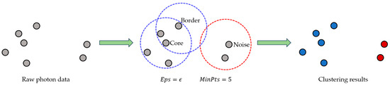The DBSCAN algorithm, which is a density-based clustering algorithm, was proposed by Martin Ester in 1996 [18]. This algorithm distinguishes signal points from noise points by identifying and connecting points with similar densities (i.e., clusters). The advantage of the DBSCAN algorithm lies in its simplicity and computational efficiency. It mainly depends on two parameters, EPS and MinPts. When the number of points within the specified neighborhood radius exceeds the set minimum number threshold, the point is considered a signal point. This method is especially suitable for processing datasets with complex spatial distributions and can effectively separate signal points and noise points. Figure 6 is a schematic diagram of the DBSCAN clustering principle.