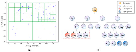 Figure 8a shows the case where the pre-judged quadtree splits some photons. Compared to Figure 7a, the quadrant within the green box in the upper left corner is no longer divided according to the division criteria. The corresponding tree structure in Figure 8b shows that the noise photons within the red dashed box are no longer divided. By introducing the pre-judged strategy, the layer value of noise photons is low, while that of signal photons is high, thus allowing for classification through calculating the segmentation threshold.
