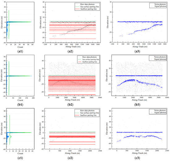 Figure 9 shows the denoising results for each experimental area (Oahu Island, Dongdao Island, Huaguang Reef, and Ailinginae Atoll). The first column depicts the photon density and KDE curve; the second column illustrates details of the multiscale analysis, and the third column demonstrates the denoising results of the method proposed in this paper.