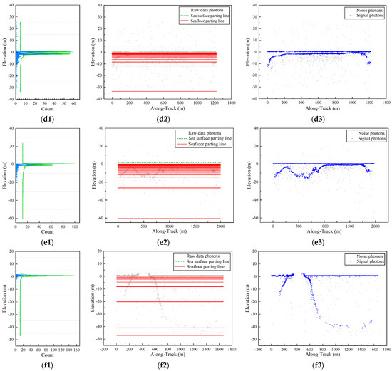 The location information of the study area is shown in Figure 1. The six selected study areas have good water quality, and the laser has good water permeability. The study areas are far from each other to avoid the influence of geological correlation, and the seafloor topography changes significantly, including that of laser beams from different periods with different strengths. The selection of research data is diverse, which can verify the effectiveness of the method in this paper from multiple angles and intuitively verify the universality of the denoising algorithm utilized in this paper.