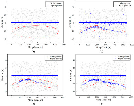 Comparison of Dongdao Island denoising results in 10 September 2022. (a) ATL03 results. (b) DBSCAN results. (c) Quadtree results. (d) Results of the proposed method.