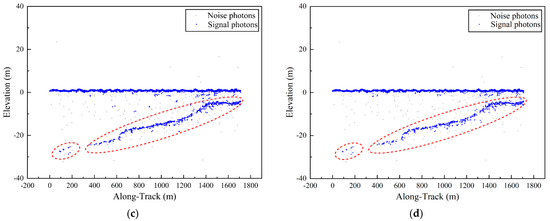As shown in Figure 9, photon density is highest at the sea surface. As water depth increases, photon density declines gradually. The green dotted line depicts the noise extraction threshold above the sea surface, while the red solid line denotes the segmentation value for the underwater window. The window distribution exhibits a trend of being dense in shallow areas and sparse in deeper areas. Experimental results demonstrate that the proposed method can effectively remove noise photons in the experimental area and accurately capture the precise contours of the underwater terrain. However, in deeper water, due to the sparse number and distribution of photons, some photons remain unidentified as signal points and are filtered out.